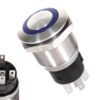 ON-(ON), palauttava: kun katkaisinta ei paineta, se palautuu alkuasentoon, ilkivallan kestävä, sininen led. 2.8mm liittimet, max 10A, asennusaukko ø19mm, asennuslevy ø22mm, kokonaispituus 38mm, IP67
