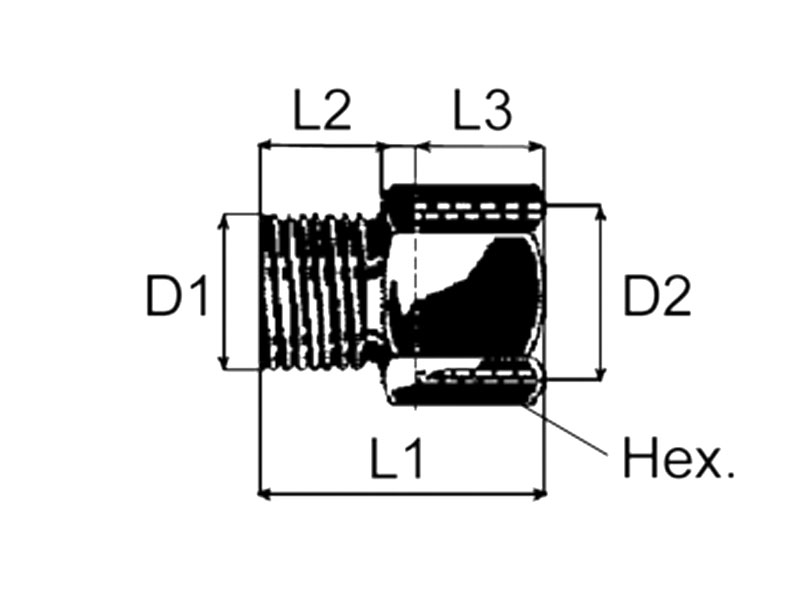 M26-M22, putki ø 16 mm, avainkoko 32 mm, D1: M26x1.5 (ulkop.), D2: M22x1.5 (sisäp.), L1: 30 mm, L2: 12 mm, L3: 14 mm